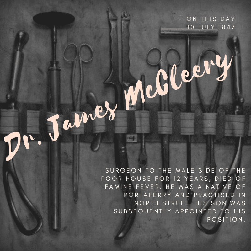 The year 1847 was a dark one in Irish history, known as Black ’47, due to the number of famine related deaths. It wasn’t just the labouring classes who were impacted – many doctors, minsters and priests died due to contracting various diseases which fell under the ubiquitous term of ‘famine fever’, when helping the poor. One such example was Dr James McCleery, surgeon to the male side of the Poor House for 12 years, who died on this day (10th July) 1847. He had contracted famine fever from his patients. Surgeon McCleery, as he was referred to in our minute books, was a native of Portaferry and opened a practise in North Street, Belfast. Surgeon James McCleery was subsequently interred in the family plot in Clifton Street Cemetery.