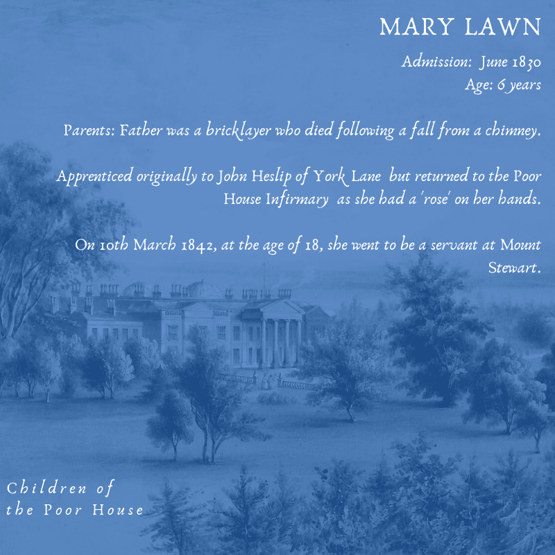 Once Mary had recovered, she left the Poor House for the final time to be a servant at Mount Stewart, the country seat of Charles William Vane, 3rd Marquess of Londonderry. Perhaps there is still more to be uncovered of Mary Lawn’s story in other archives?