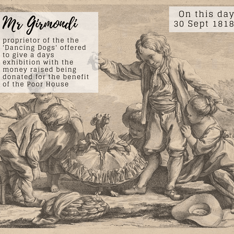 There have been some unusual donations to Belfast Charitable Society over the years, many of them recorded on huge wooden boards with the details of donors stencilled on. On this day (30 September) 1818 Mr Girmondi, who was in Belfast entertaining the citizens of the town, became one of these donors. Girmondi was the proprietor of a troop of ‘Dancing Dogs’ and he donated a days takings from his exhibition to the Poor House in order to support its work.