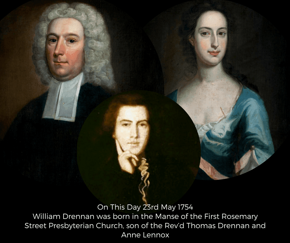 On 23 May 1754 Anne Drennan née Lennox gave birth to her youngest son, William Drennan. Anne was the wife of the Rev Thomas Drennan, minister of the First Presbyterian Church, Belfast, and William was born in its manse. William Drennan would grow up to become a renowned physician, poet and patriot. Due to the Penal Codes limiting access to third level education in Ireland, many Presbyterian ‘sons of the manse’, such as William, attended university in Scotland. He studied arts in Glasgow (1772) and completed his medical studies in Edinburgh (1778). Dr Drennan was heavily influenced by enlightenment ideas and thinking.