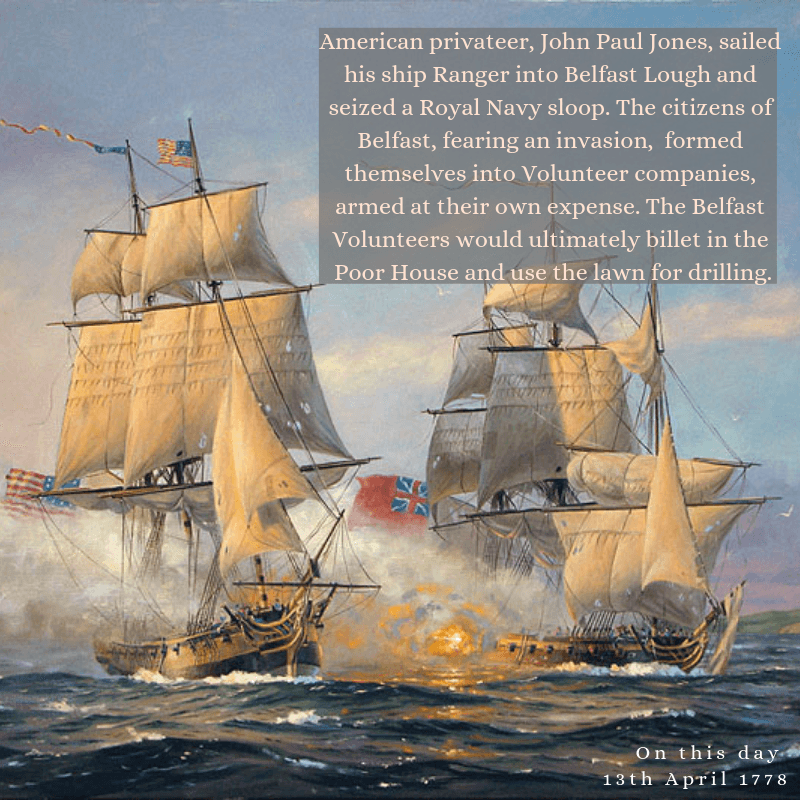 On 13th April 1778 the American Revolution was brought to our shores. John Paul Jones, a Scots-American, sailed his privateer, the Ranger, into Belfast Lough. He attacked, and captured the British warship HMS Drake and made off with its cargo.